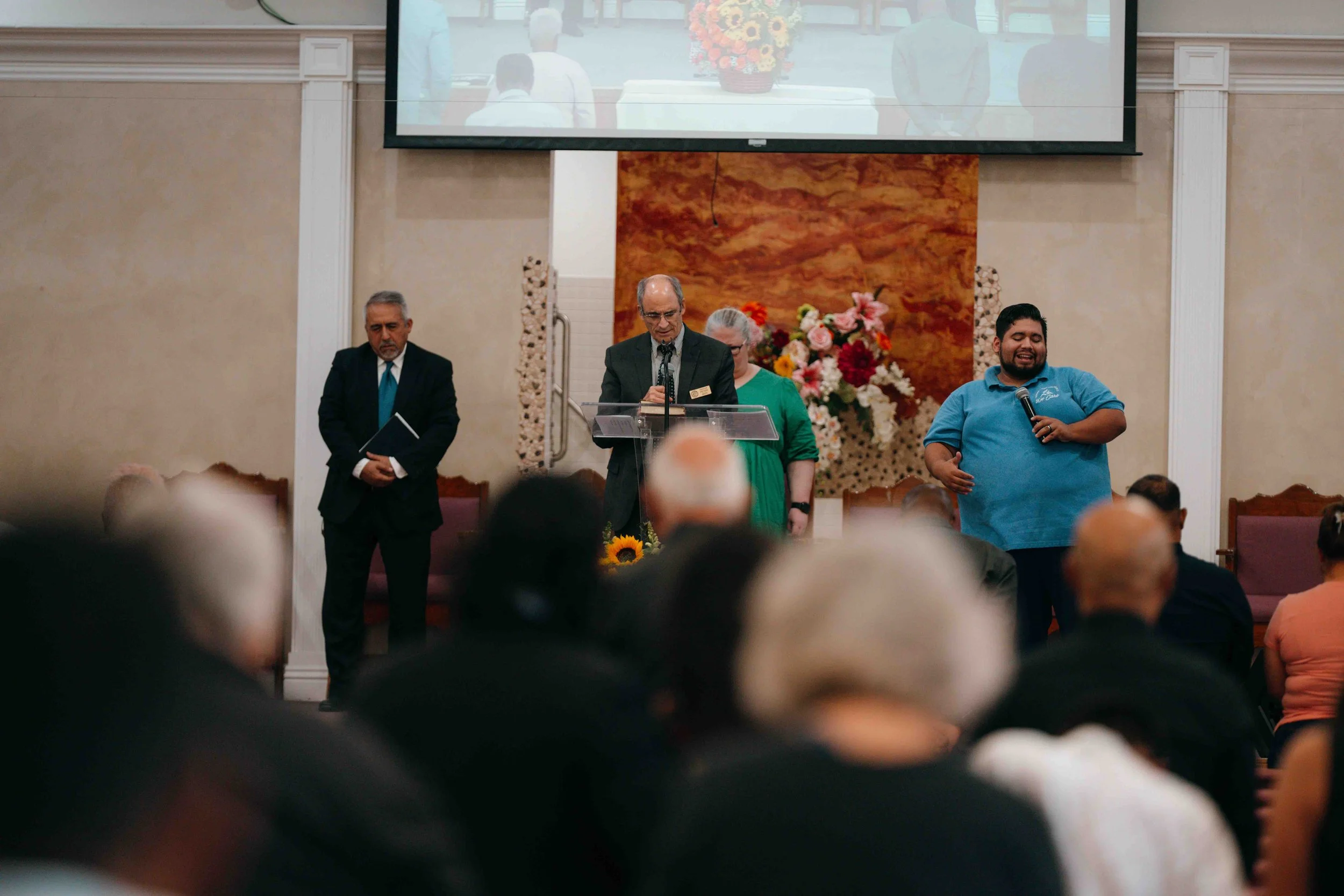 Pastor Peter Neri, reading a promise from the Bible while Pastor Rodolfo Paredes translates it into Spanish. Also on the platform, from left to right, Pastor Ramon Verduzco and Pastor Melody Darrow