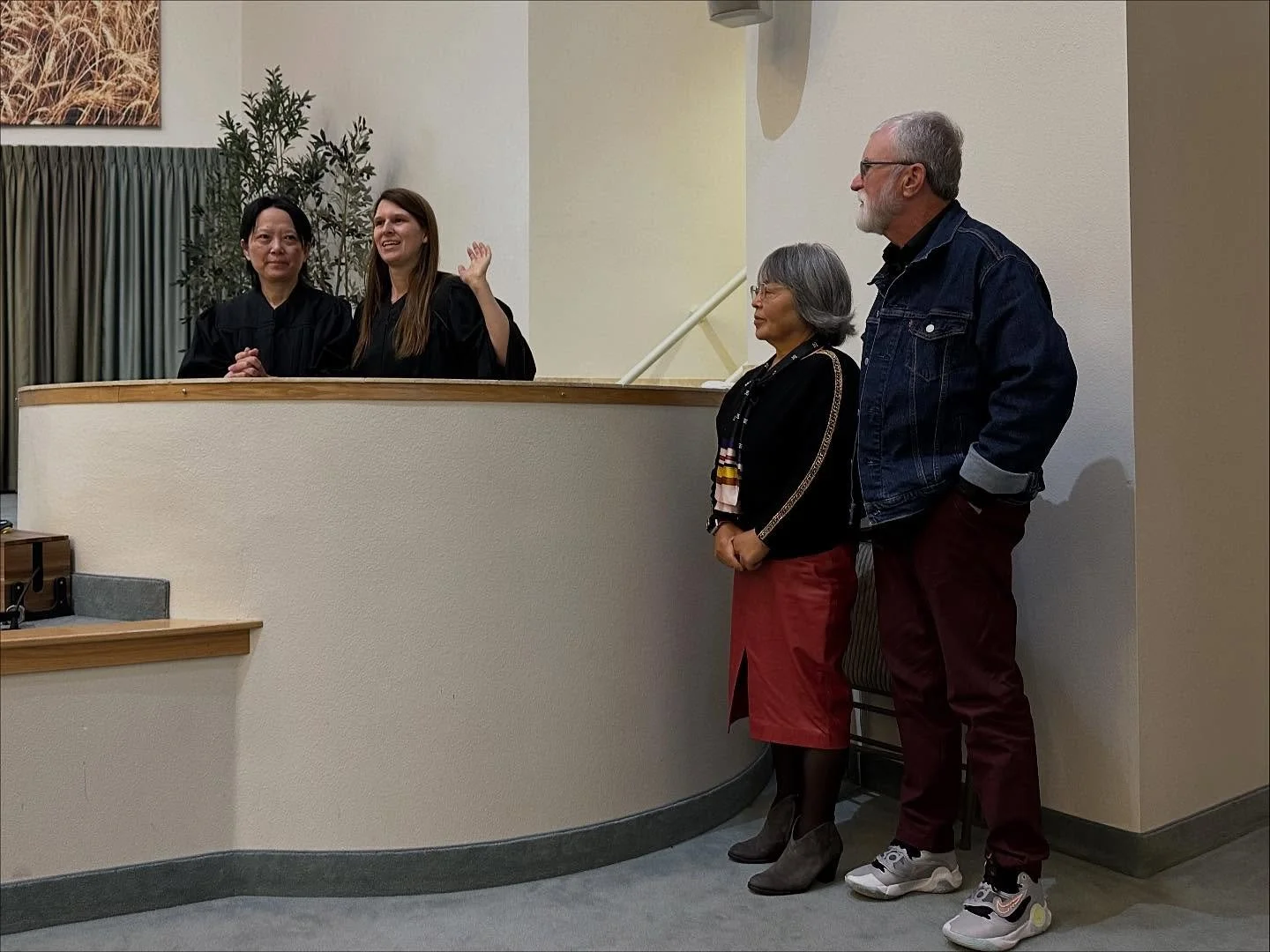 Qiong with Pastor Deirdre Solomon in the baptistry. The Bentjens stand nearby to support.